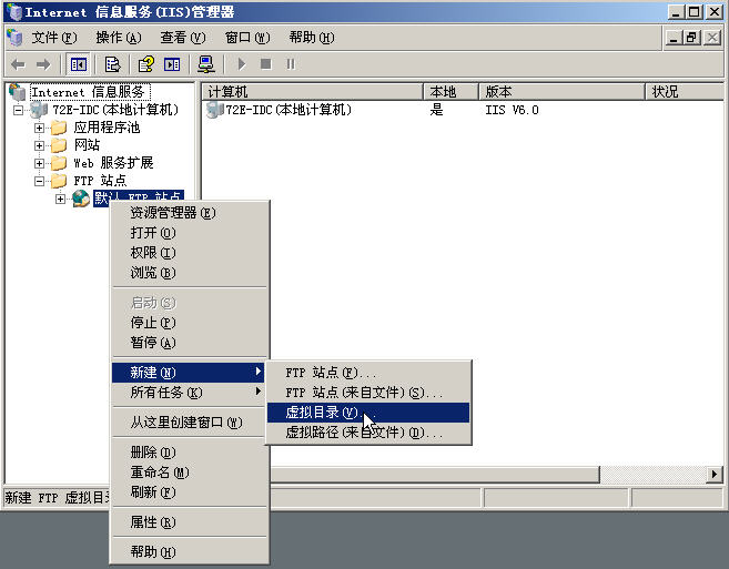 開(kāi)始--->程序--->管理工具--->IIS信息管理器 打開(kāi)IIS管理工具.展開(kāi)FTP站點(diǎn),在"默認(rèn)FTP站點(diǎn)上右擊--->新建"虛擬目錄" | |