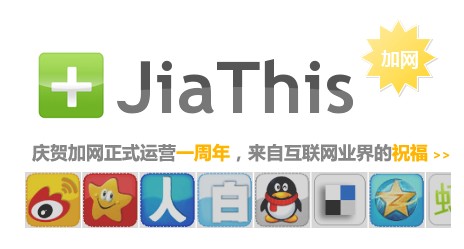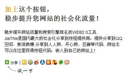 JiaThis是國(guó)內(nèi)最大的社會(huì)化分享到按鈕提供商:提供分享到QQ空間、新浪微博,分享到人人網(wǎng)、開(kāi)心網(wǎng)、豆瓣等代碼...網(wǎng)站主可以在這里獲得按鈕代碼,嵌入到自己的網(wǎng)站上!