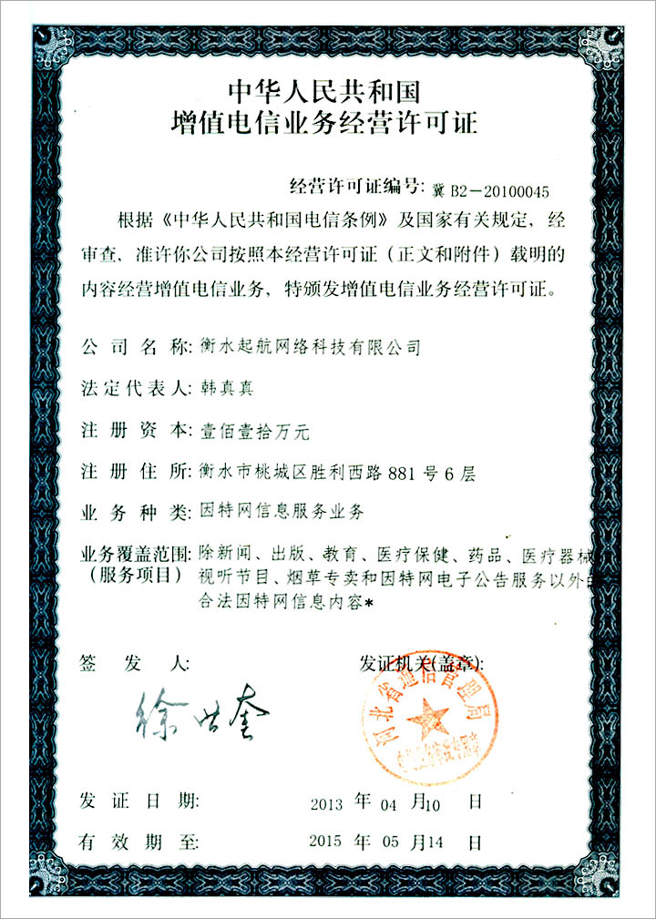 衡水起航網(wǎng)絡科技有限公司已于近日順利獲得省通信管理局頒發(fā)的增值電信業(yè)務經(jīng)營許可證,證書號碼:冀B2-20100045 。